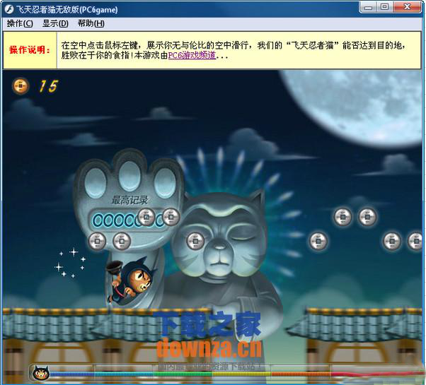 飞天忍者猫是一款经典flash小游戏,全称是QQ飞天忍者猫,所以本站提供的飞天忍者猫作弊器也可以叫做QQ飞天忍者猫作弊器,玩家只需控制点击鼠标的时机来赢得无限的金币和银币。帮助飞天猫到达目的地,收集金币。一个金币50分,一个银币5帮助飞天猫尽量收集更多的金币,收集一个金币可获得50分,收集一个银币可获得5分。遇到坑时要点击左键跳跃,遇到高塔时需双击左键投出绳索跳过,当落入坑里时游戏则会结束作弊器貌 飞天忍者猫无敌版下载