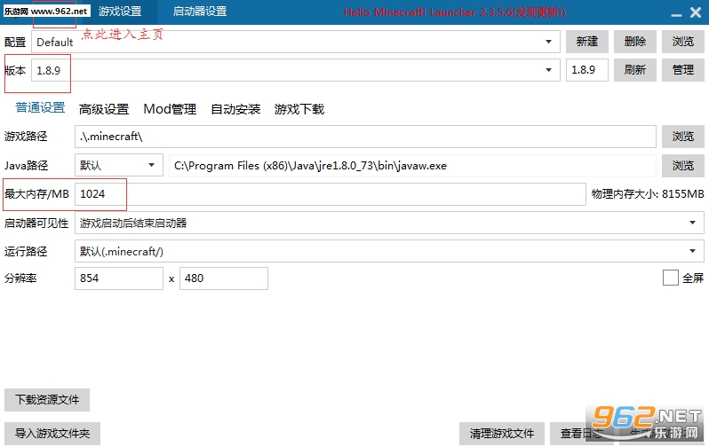 第二步,设置内存大小为1024(如果不修改可能会提示内存不足,启动游戏错误);
