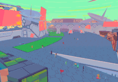 Sundae Month 在推特上贴出的动图很好地说明了这一点。那个星球城市的环境、建筑和市民,在短暂十几秒 GIF 里得到了生动展示。你可以看到晨昏轮回、阴晴变幻,看到小巷、后街、广场、桥梁和店铺,看到形形色色、奇奇怪怪的市民行走往返。游戏用立体像素的 3D 风格,构造了一个无缝连接的城市,将酒吧、银行、商店等各式建筑和长耳朵的兔子,漂亮的蝴蝶夫人、电视头机器人等各色市民,一一填充进去,加上天气光影,让一切在这个世界里运作开来,人们来来往往,走走停停,闹市街头永远熙熙攘攘、人头攒动,更别提在为期九天的一周的最后一天,所有人都会上街集会、玩乐、唱歌。间或巨大的飞艇在空中划过,留下一条炫目的光带。城市在自然流动变化,生活显得琐碎而真实。
