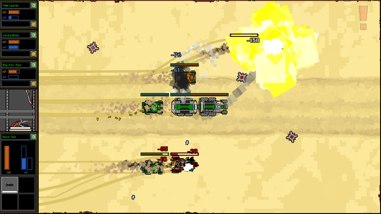 在大地图的移动过程之中,玩家会随机遭遇到各种各样的时间,其中当然少不了战斗事件。一旦进入战斗,就能看出RTS游戏的本质了,玩家用左键来选择车辆,右键控制选择单位移动并且击败敌人。不过可供玩家控制的单位不包括护送的车辆。游戏的战斗更加注重战略性,而不是更加微观的操作等战术层面。在战斗之中基本是你来我往式的战斗,没有办法躲避敌人的攻击,只能让车辆接近敌人然后互相对轰(这期间还要注意敌人的地雷之类的武器,还有地形障碍带来的威胁)