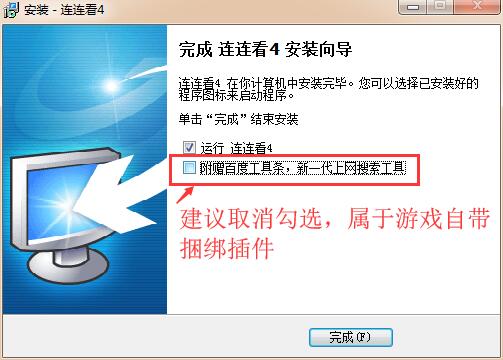2、如图所示安装完成,但是需要注意,该游戏安装包自带捆绑插件(即最下方的待勾选项),小编建议大家取消勾选即可。