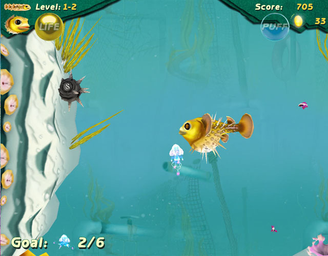 《河豚鱼之旅》是一款与“吞食鱼”有点类似的游戏,不过在游戏中玩家控制的将是一只“刺豚”,每个关卡会有相应的过关要求,吃小鱼或攻击其它鱼类都具有规定的数量,有些关卡还会有时间限制。玩家将使用鼠标来控制河豚鱼的行动,点击左键使身体膨胀来攻击敌人。