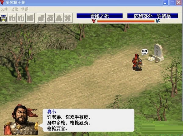 东吴霸王传2011圣诞版是根据曹操传制作出来的mod,孙策、曹操、刘备三人,曹刘是友军,战前可以选择是否控制曹刘。而他们三个随便一个人挂了都会战斗失败,请各位留意了。一开始孙策是什么装备也没有的,不过凭借X的攻击与S的防御属性还可以抵挡一阵子,与左面的黄巾首长接触,会得到铁铠并且自动装备,这样才能触发与张角的单挑,如果张角直接被杀,剧情最后也是被孙策挑死的,张角死后得到霸王枪也是自动装备,本关敌全灭可以得到印绶,但消灭张角与张梁会直接过关,所以两张要最后杀!