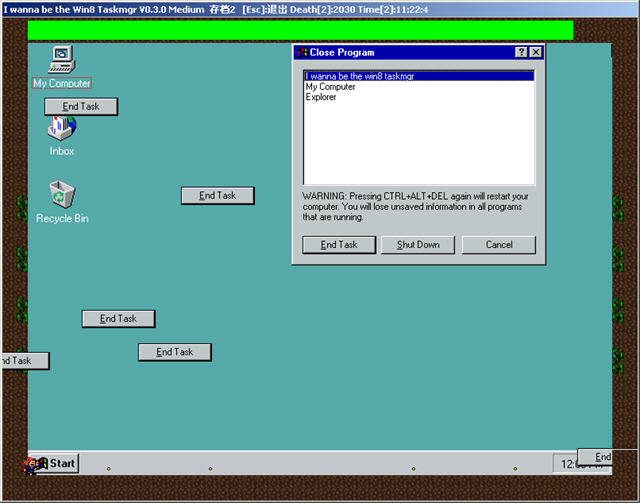 相信如果你是一个资深的电脑玩家,那么一定见证过多个时代的操作系统,最初的dos我到是没接触到过,从win95系列到现在win7还有已经渐渐开始试用的win8,几乎历代操作系统的都有接触。这款i wanna be系列,出人意料的使用了神奇的windows系统来作为主题。