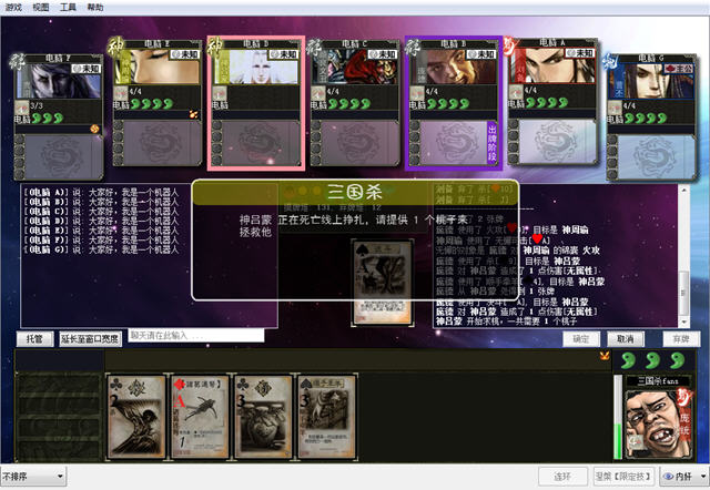 这款三国杀单机版中,已经加入了AI,之前有的单机版在启动游戏后无法开始游戏,需要等待同局域网中的其他玩家来加入,这个版本很好的解决了这个问题。