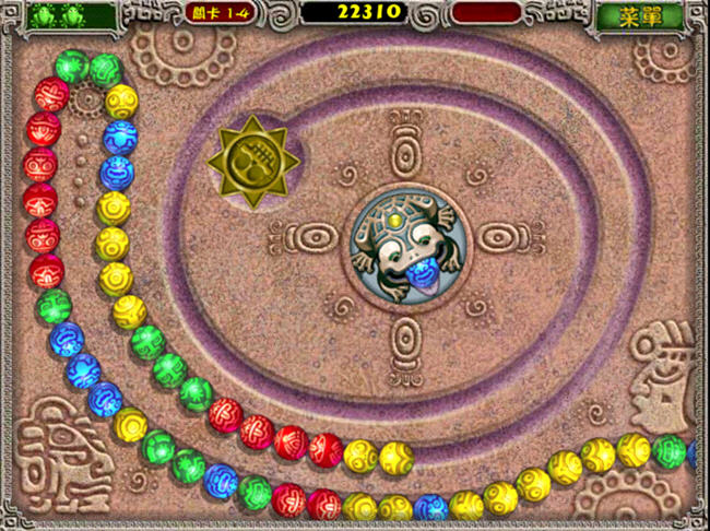 石青蛙制止小球滚进轨道尽头的洞里的要领便是用吐出小球与轨道上的小球相联合,颜色雷同且数量到达三个上面就会消除得分。祖玛传奇(Zuma Deluxe)屏幕右上方有一个分数格。