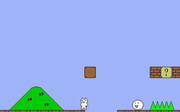 开局看起来和FC的《超级玛丽》没有很大区别,只是主角变成了一个可爱的小白猫,怪物变成了和馒头差不多的东西。游戏中有很多让人意想不到的陷阱,比如跳跃壕沟的时候头顶上会莫名其妙的多出一个砖块而让玩家掉进壕沟、好好的地面突然会塌陷下去、眼看过关了又有个不明飞行物将玩家砸死...
