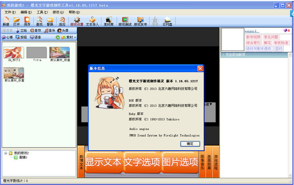- 画面显示 - 音乐/音效/语音资源列表宽度调整- 事件编辑 - 修正文本编辑框中设置文字颜色可能产生的崩溃问题 - 修正文本编辑框文字颜色设置错位问题 - 文本编辑框处于【显示源代码】模式时,禁用文字颜色和停顿设置 - 修正了文编辑框无法记录用户对源代码显示偏好设置的问题 - 分歧判断中与鲜花有关的比较判断分支只保留【大于等于】和【小于】两种- 游戏发布 - 修正部分由于缺少系统文(如font.list、Game.bin等)件导致打包失败的问题 - 在打包前检查工程完整性并告知用户 - 修正由于导入UI时文件缺失导致打包失败的问题- 游戏设置 - 修正导出UI时由于某些设置错误导致UI无法被使用(或使用后打包失败)的问题