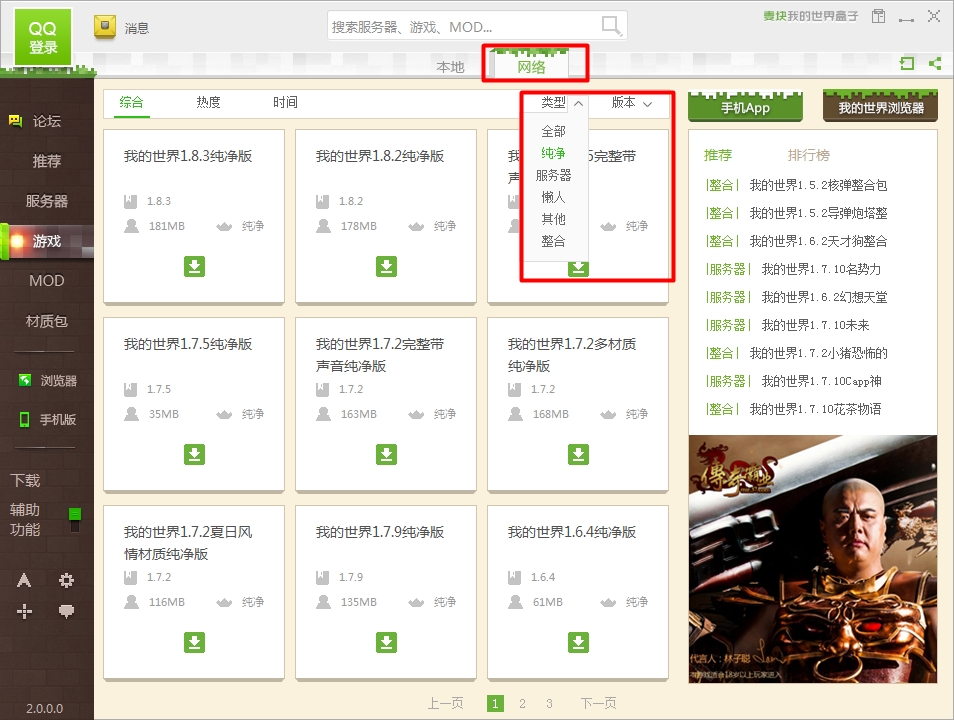 2、进入游戏选项网络部分,选择游戏下载,可以按类型和版本进行分类,首次接触的朋友推荐选择纯净版