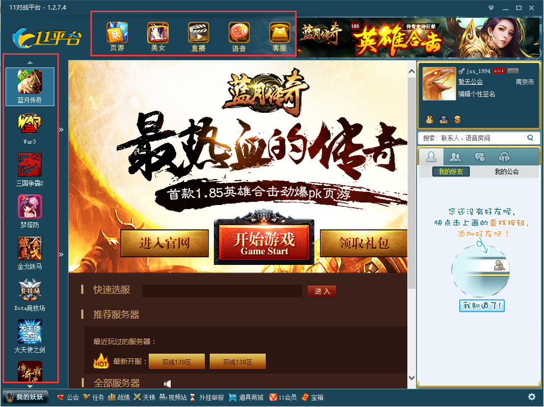 2、平台最左侧部分列示了目前平台上支持的游戏,点击后可以进入相关游戏大区;