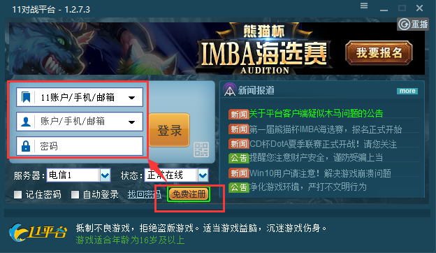 双击11对战平台的图标进入登录界面,如果没有账号,可以先注册一个账号,注册成功后,输入账户和密码,点击登录进入游戏