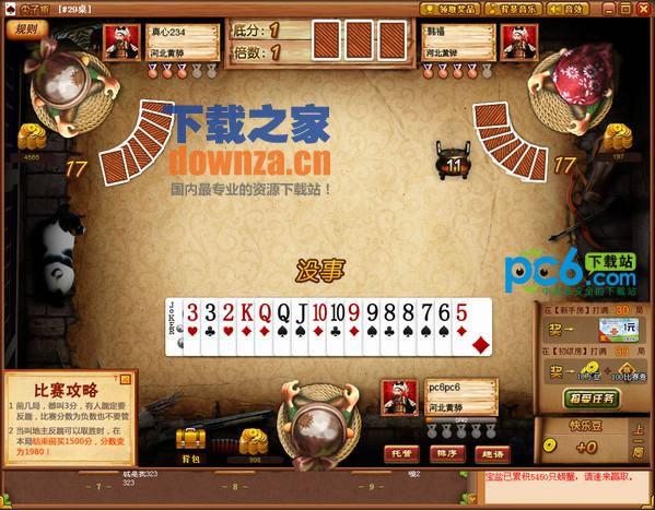 该游戏基本上由三到六个人玩。(三个人玩法):用一副牌共 54 张牌。拿底牌(3张)者为一方,其余两家为另一方,双方对战,先出完牌的人所代表的一方获胜。(四个人玩法):除双王外的52张牌。一般找两张记牌(红桃A、方块A),抓到红桃A和方块A的是一组,其余两人一组。如红桃A和方块A由一人抓到,那么本人可以要一张牌(红桃4.5、方块4.5、全A、全2、全3不可以要)作为自己的朋友。(五个人玩法):用一副牌共 54 张牌。抓到大王和小王的是一组,其余三人一组。(六个人玩法):用一副牌共 54 张牌。抓到大王和小王的是一组,其余四人一组。