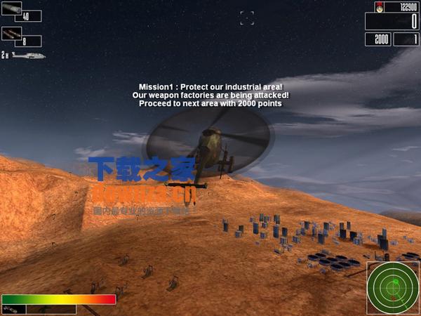 画 面:在有限的容量下3D的图象效果刻画不错。进入游戏后,玩家可以直观的看到飞机的各种状态,屏幕左下方绿色的代表血,左上方是飞机的导弹和子弹,右下方显示的是雷达。 声 音:游戏中背景音乐采用了充满激情的摇滚乐风格,所表现出紧张刺激的效果,很好的突出这款游戏的特点。 上手度:游戏的按键比较简单,鼠标控制飞机的前后左右,左键是机枪,右键是导弹,方向键控制飞机的飞行方向。 创 意:在这款武装直升机模拟游戏中,玩家将控制大型战斗直升机去完成各种任务的游戏,多元化的任务系统使游戏的内容变得丰富。 可玩性:游戏中可以选择两种直升机:MD500或者长弓阿帕奇,从城市的一点飞向另外一个城市作战。其间,如果你击落敌人飞机,那么你得到的点数也就越多。但是如果你失败,城市将被毁灭,分数也将被扣除。