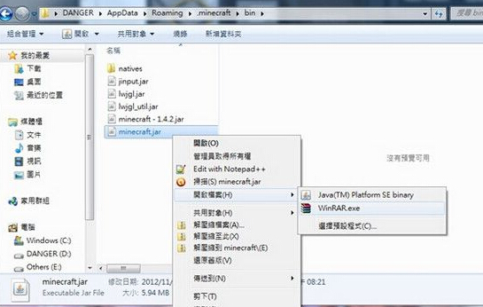 5、下载你想安装的Mod,将Mod解压缩至一个资料夹中(由于我把文档放在桌面,因此我就解压到桌面的一个文件夹中),将内容全部拖进minecraft.jar里,重复的话就给他覆盖下去。