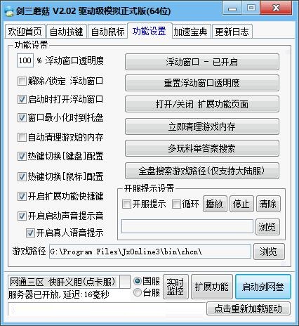 XP专用版(32位):只支持XP 32位系统 使用时无需手动安装驱动,剑三蘑菇启动时会自动释放驱动文件,此时必须杀毒放行,否则不能加载驱动.