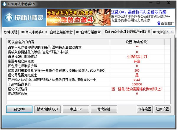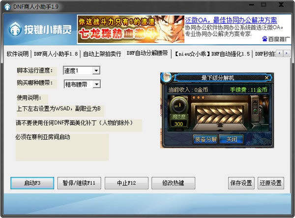 PS:游戏必须窗口化,鼠标放在DNF游戏窗口后才能启动脚本,如果发现启动后dnf窗口没有自动拉到左上角,请重新启动。窗口化后,然后选择相应要的功能,然后点下右下角的保存设置,记住一定要保存,否则脚本会出现错误,最后启动。