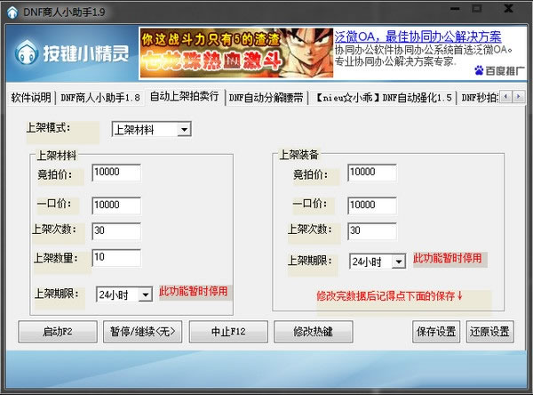 自动上架(装备):先打开拍卖行,填好要上架的一口价和竞拍价格还有上架次数,把要上架的装备放到第一排最前面。然后启动