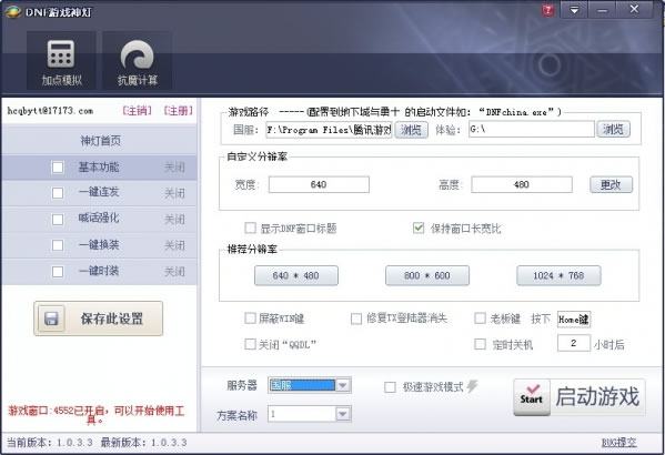 自定义分辨率,主要是更改游戏窗口的,不过一般还是用默认的,640*480会好一点,画面像素看起来精致。由于DNF目前画面只能支持这么大,所以拉伸会有模糊的效果。等随韩服更新到1080Pyi好了。屏WIN键,主要是屏掉键盘上的WIN键,防止影响游戏的乐趣。 修复TX登陆器消失,有时因为机器太卡会造成TX经常登不上去的情况,这时在进程管理器里关闭几个TX的进程就会好,该功能帮用户直接关闭部分进程。老板键选中后,只要按“HOME”就可以一键隐藏游戏窗口,再按一次,会再弹出来。当然你也可以用其它键,但不要和游戏里的其它键冲突。 关闭“QQDL.exe”,主要是每次DNF升级客户端后,此程序会一直占用大量带宽上传数据,这时可以选中,就可以关闭此进程。