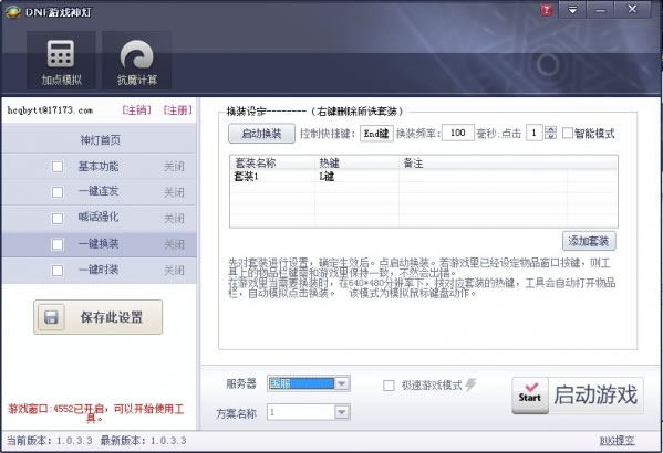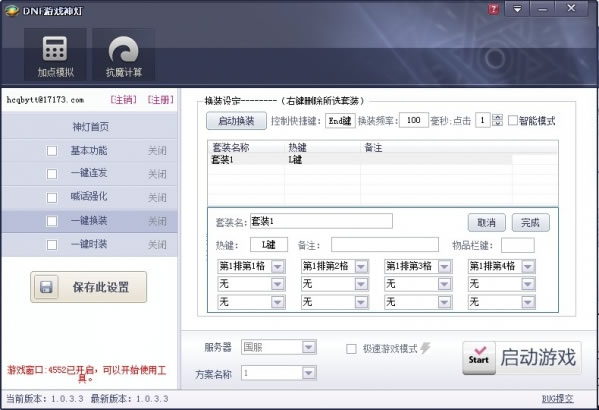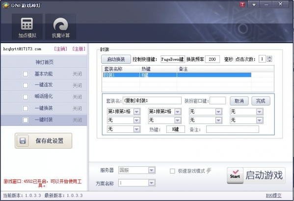 此物品栏键对应的是玩家在游戏里设置的打开物品栏的快捷键,需自己手动设定,一定要保持和游戏里的一样,不然有可能会出错。 换装原理是这样:在640*480模式下,按下“L”后,软件会自动在游戏里检测物品栏有没有开,开的话就直接按着第一格,第二格……进行模拟鼠标点击换装,换装后关闭物品栏。 若物品栏没有打开, 同时物品栏键为空,这时就会自动点击,去打开物品栏,然后进行换装,换装后,关闭物品栏。若物品栏没有打开,但物品栏键已经设置好了,这时软件就会自动按物品栏键,然后换装,换装完关闭物品栏。 换装我们也增加了控制快捷键,同时,你可以手动设定换装频率,不是很急的话就设成100,基本上机器一次可以搞定。 如果很急的话并且在图里(在图里装备更换会有一个CD),用换装频率10。然后点击3次。基本也可以实现全部换装。 另外还有一套智能换装,智能换装目前不是非常快,但是比较稳定。有一个注意就是,你换装的格子中,不能有空的格子,就是你设定的每个格子里面必须是你要换的装备,如果会空,程序会一直卡在空的格子上,这时需要手动关闭神灯,重开神灯才能解除。