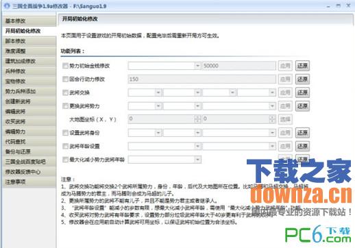 3.4版更新内容:1、修正了编辑大众卫队武将名字时会改变大众卫队名称的bug。2、增加了编辑势力地图颜色的功能。3、增加了降低敌方所有武将忠诚度的功能。4、解决游戏中部分武将心灰意冷状态下无法被收买的bug。3.3版更新内容:1、修正了一些bug,比如编辑武将坐标会发生变化的bug。2、创建新武将页面的爵位增加了自定义功能。3、难度修改页面中,增加了禁用电脑驿站加成,禁止电脑生产刺客,以及能够编辑电脑太守加成几率的新功能。3.2版更新内容:1、增加了1.9a中特有的马匹,1.9a特有的马匹一般冲量都比较大,老版马匹冲量较小。2、修正了武将地图坐标自动计算错误的bug。我把RGB颜色值写错了,另外遗漏了森林颜色。3、修正了编辑新武将坐标和兵模无效生效的bug。4、增加了孙刘曹中特殊武将不能被交换到其他势力的注释。3.1版依然是最好先还原到初始档,然后重新备份一下初始档。如果不希望重新开局,以下提供正确的操作步骤:1、进入备份与还原界面。2、选择“备份当前游戏数据“进行备份。3、选择“还原游戏至初始档状态“进行还原。4、选择“设置当前游戏数据作为游戏初始档”进行备份。5、在还原备份数据的列表中选择步骤2备份的数据存档进行还原就可以正常进入游戏,并且更新了原始档。3.1版更新内容:1、修正了未对掌旗官旗帜,城市旗帜,援军,盟军旗帜做修改的bug。2、修正了编辑武将人物列传未繁体化,换行的bug。3、增加了修改势力后代武将姓氏的功能。3.0.1版更新内容;1、更新了压缩武将图片的算法,让武将图片显示的更加清晰。2、修正了解压缩更新包,仅支持GBK编码的bug。3.0版更新内容:1、新增编辑势力功能。2、修正编辑武将坐标可能导致游戏异常的bug。3、修正禁止电脑驿站暴兵的bug(此处bug是由于1.9和1.7的驿站代码不一样导致的)。4、增加了添加势力兵种对兵营的要求,提高游戏的可玩性。5、增加了对城墙生命值的修改。6、增加了武将身份设置功能,方便玩家自定义君主或者继承人。7、增加了修改器的自动更新功能,3.0及其后续版本若发现修改器有新版本,将会自动更新到最新版本。注意事项:因为3.0版改动较大,若使用编辑势力功能,请首先还原游戏数据到初始状态,重新做一次原始备份档,否则编辑势力后,无法还原到游戏原始状态。2.4版修正了对新武将执行武将交换操作导致跳出的Bug。2.3版修正了交换武将时,没有对儿子的关系交换,导致游戏跳出的Bug。2.2版对兵种士兵模型的替换做了限制,以免发生替换后游戏跳出的问题。新增了修改器调试器,方便修改器遇到问题时的反馈,详见“说明”文档。